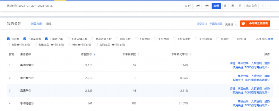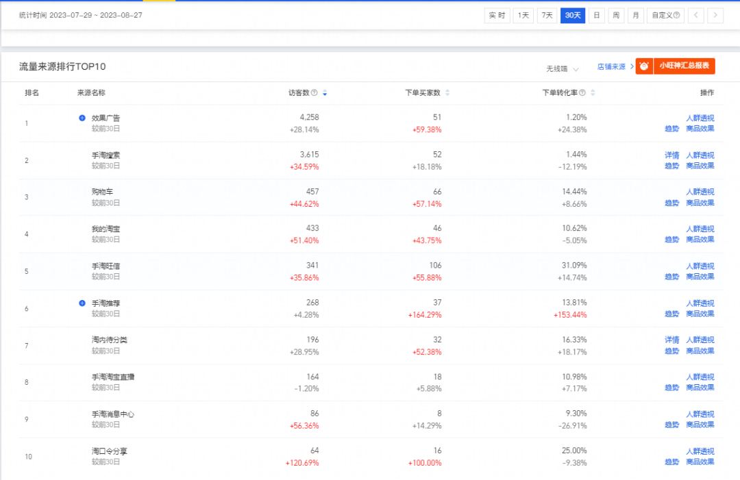 3.店鋪核心詞和轉(zhuǎn)化人群確定之后,看整體店鋪流量結(jié)構(gòu),流量結(jié)構(gòu)轉(zhuǎn)化率對比,免費流量轉(zhuǎn)化高就重點規(guī)劃周期增加免費渠道流量,優(yōu)化店鋪人群,階段轉(zhuǎn)化穩(wěn)定提高。