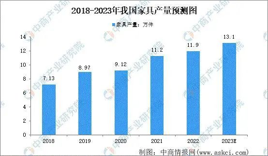 作為全球家具生產(chǎn)中心,早在2006年中國家具產(chǎn)業(yè)產(chǎn)值已躍居世界第一位,中國已然成為世界家具生產(chǎn)、消費及出口大國。2022年我國家具業(yè)產(chǎn)量11.9萬件,同比增長5.9%。預(yù)計2023年我國家具行業(yè)產(chǎn)量將達13.1萬件,同比增長10.05%。