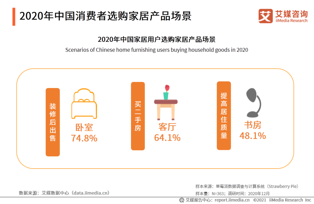 調(diào)查顯示,2020年,中國家居用戶選購家居產(chǎn)品場景分布中,“裝修后出售”為臥室購買家居產(chǎn)品的占比最高,為74.8%;裝修原因為“買二手房”中,為客廳購買家居產(chǎn)品的占比最高,為64.1%;為“提高居住質(zhì)量”而為書房購買家居產(chǎn)品在各場景中占比最高,為48.1%。臥室作為人們進行睡眠放松的場所,勢必成為家居用戶“裝修后出售”而購買家居產(chǎn)品的首選。