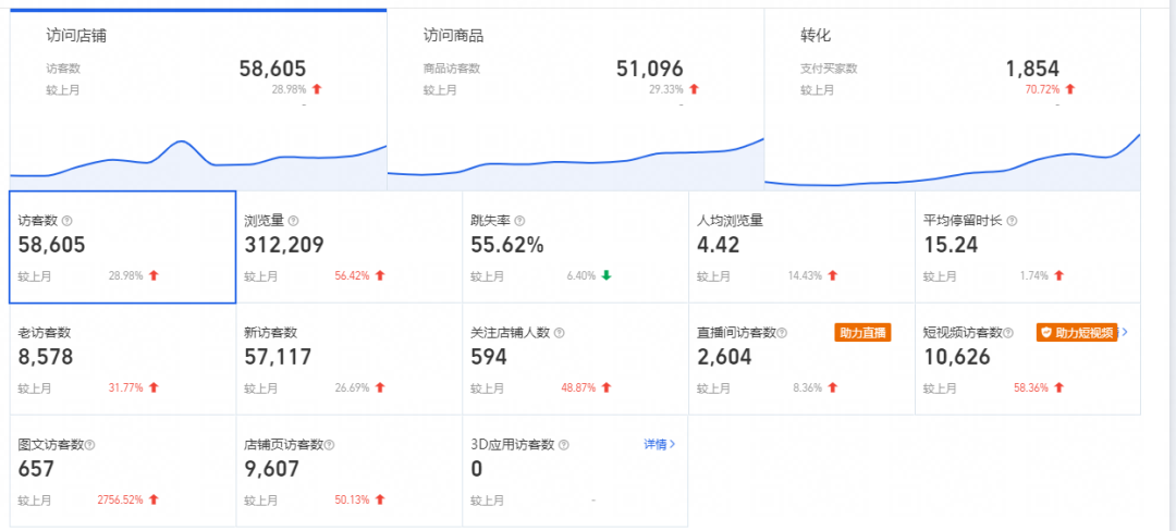 在火蝠電商運營人員光灝(花名)的幫助下,通過制作與產(chǎn)品契合的視頻內(nèi)容同淘寶光合平臺推廣結(jié)合的方式,有效地提高了產(chǎn)品的知名度和吸引力,精準獲客進而促進銷售額增長,單月成交額超30W+,對比增長140%,同時訪客數(shù)增長59.23%。