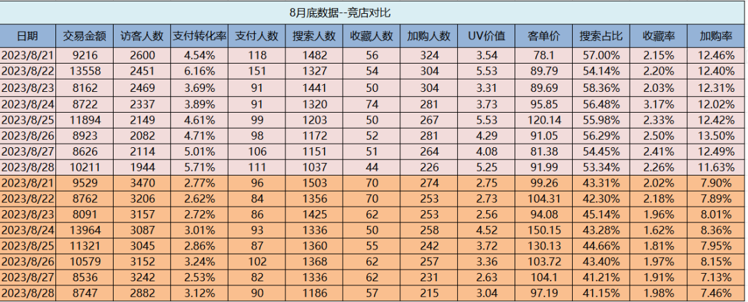 “了解競店的爆款產(chǎn)品,進行數(shù)據(jù)對比。因為各個店鋪結(jié)構(gòu)的不同,我們會進行對應(yīng)的改變,使用差異化競爭。”光灝告訴我們,“每周競店數(shù)據(jù)進行對比,持續(xù)感知競店的實時動向,避免運營品牌店鋪被超越?!?/span>