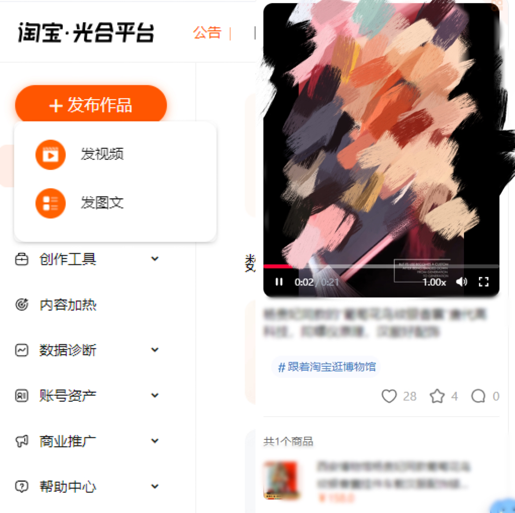 第三步發(fā)布光合平臺:制作完成后的視頻來發(fā)布光合平臺,選擇發(fā)視頻(視頻滿足條件:mp4、mkv、mov格式上傳,720p 以上,文件最大1.5G,時長15分鐘以下)。編輯其產(chǎn)品相關(guān)的標題和文案,添加當時的熱點話題“跟著淘寶逛博物館”,同時添加對應(yīng)產(chǎn)品的跳轉(zhuǎn)。每周進行發(fā)布4-5篇內(nèi)容,來持續(xù)曝光產(chǎn)品獲得對應(yīng)流量,開始店鋪幾乎沒有內(nèi)容流量,發(fā)布引導(dǎo)訪客數(shù)增加2w+。