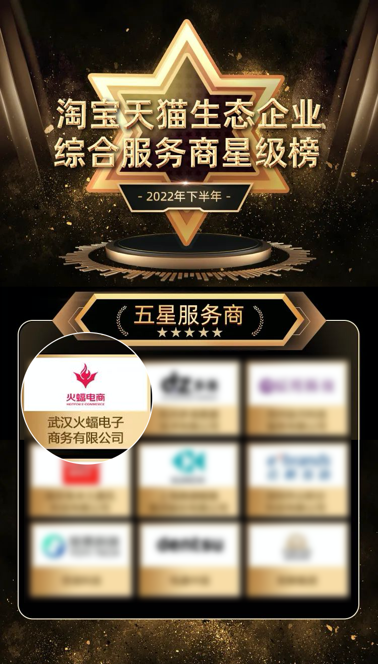 近日,2022年下半年淘寶天貓生態企業評級評優榜單正式發布,火蝠電商憑借專業的精細化運營服務能力與優質的數字化經營能力,再次榮獲綜合服務商星級榜五星級服務商。
